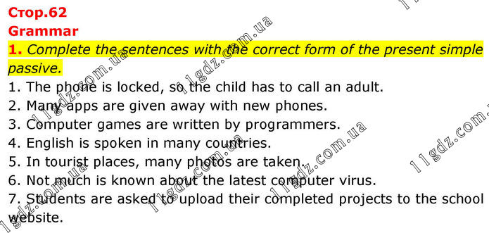 Grammar 1. Complete the sentences with the correct form of the present simple passive. 1. The phone is locked, so the child has to call an adult. 2. Many apps are given away with new phones. 3. Computer games are written by programmers. 4. English is spoken in many countries. 5. In tourist places, many photos are taken. 6. Not much is known about the latest computer virus. 7. Students are asked to upload their completed projects to the school website.