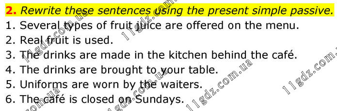 2. Rewrite these sentences using the present simple passive. 1. Several types of fruit juice are offered on the menu. 2. Real fruit is used. 3. The drinks are made in the kitchen behind the café. 4. The drinks are brought to your table. 5. Uniforms are worn by the waiters. 6. The café is closed on Sundays.