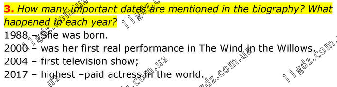 3. How many important dates are mentioned in the biography? What happened in each year? 1988 – She was born. 2000 – was her first real performance in The Wind in the Willows. 2004 – first television show; 2017 – highest –paid actress in the world.