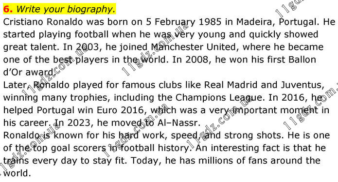 6. Write your biography. Cristiano Ronaldo was born on 5 February 1985 in Madeira, Portugal. He started playing football when he was very young and quickly showed great talent. In 2003, he joined Manchester United, where he became one of the best players in the world. In 2008, he won his first Ballon d’Or award. Later, Ronaldo played for famous clubs like Real Madrid and Juventus, winning many trophies, including the Champions League. In 2016, he helped Portugal win Euro 2016, which was a very important moment in his career. In 2023, he moved to Al–Nassr. Ronaldo is known for his hard work, speed, and strong shots. He is one of the top goal scorers in football history. An interesting fact is that he trains every day to stay fit. Today, he has millions of fans around the world.