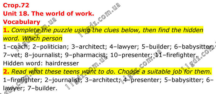 Unit 18. The world of work. Vocabulary 1. Complete the puzzle using the clues below, then find the hidden word. Which person 1–coach; 2–politician; 3–architect; 4–lawyer; 5–builder; 6–babysitter; 7–vet; 8–journalist; 9–pharmacist; 10–presenter; 11–firefighter. Hidden word: hairdresser 2. Read what these teens want to do. Choose a suitable job for them. 1–firefighter; 2–journalist; 3–architect; 4–presenter; 5–babysitter; 6–lawyer; 7–builder.