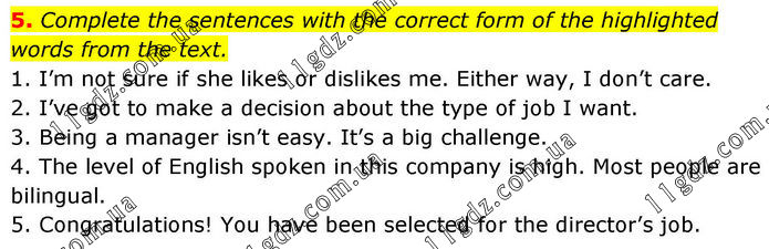 5. Complete the sentences with the correct form of the highlighted words from the text. 1. I’m not sure if she likes or dislikes me. Either way, I don’t care. 2. I’ve got to make a decision about the type of job I want. 3. Being a manager isn’t easy. It’s a big challenge. 4. The level of English spoken in this company is high. Most people are bilingual. 5. Congratulations! You have been selected for the director’s job.