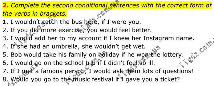 2. Complete the second conditional sentences with the correct form of the verbs in brackets. 1. I wouldn’t catch the bus here, if I were you. 2. If you did more exercise, you would feel better. 3. I would add her to my account if I knew her Instagram name. 4. If she had an umbrella, she wouldn’t get wet. 5. Bob would take his family on holiday if he won the lottery. 6. I would go on the school trip if I didn’t feel so ill. 7. If I met a famous person, I would ask them lots of questions! 8. Would you go to the music festival if I gave you a ticket?
