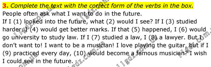 3. Complete the text with the correct form of the verbs in the box. People often ask what I want to do in the future. If I (1) looked into the future, what (2) would I see? If I (3) studied harder, I (4) would get better marks. If that (5) happened, I (6) would go university to study law. If I (7) studied a law, I (8) a lawyer. But I don’t want to! I want to be a musician! I love playing the guitar, but if I (9) practiced every day, (10) would become a famous musician? I wish I could see in the future.