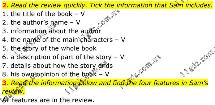 2. Read the review quickly. Tick the information that Sam includes. 1. the title of the book – V 2. the author’s name – V 3. information about the author 4. the name of the main characters – V 5. the story of the whole book 6. a description of part of the story – V 7. details about how the story ends 8. his own opinion of the book – V 3. Read the information below and find the four features in Sam’s review. All features are in the review.