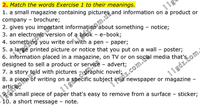 2. Match the words Exercise 1 to their meanings. 1. a small magazine containing pictures and information on a product or company – brochure; 2. gives you important information about something – notice; 3. an electronic version of a book – e–book; 4. something you write on with a pen – paper; 5. a large printed picture or notice that you put on a wall – poster; 6. information placed in a magazine, on TV or on social media that’s designed to sell a product or service – advert; 7. a story told with pictures – graphic novel; 8. a piece of writing on a specific subject in a newspaper or magazine – article; 9. a small piece of paper that's easy to remove from a surface – sticker; 10. a short message – note.