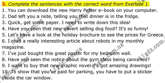 3. Complete the sentences with the correct word from Exercise 1. 1. You can download the new Harry Potter e–book on your computer. 2. Dad left you a note, telling you that dinner is in the fridge. 3. Quick, get some paper. I need to write down this idea! 4. Have you seen that new advert selling dog food? It’s so funny! 5. Let’s have a look at the holiday brochure to see the prices for Greece. 6. I read a really interesting article about robots in my monthly magazine. 7. I’ve just bought this great poster for my bedroom wall. 8. Have you seen the notice about the gym class being cancelled? 9. I want to buy that new graphic novel it’s got amazing drawings! 10. To show that you’ve paid for parking, you have to put a sticker inside the car window.