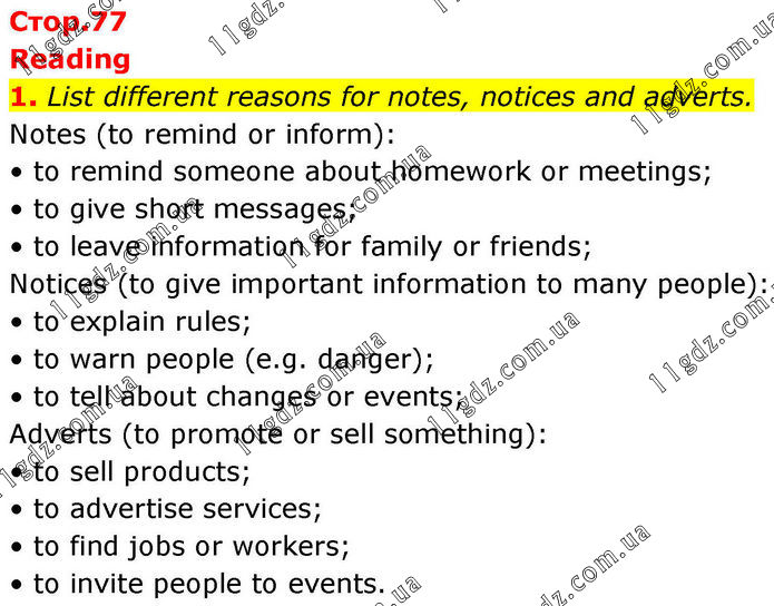 Reading 1. List different reasons for notes, notices and adverts. Notes (to remind or inform): • to remind someone about homework or meetings; • to give short messages; • to leave information for family or friends; Notices (to give important information to many people): • to explain rules; • to warn people (e.g. danger); • to tell about changes or events; Adverts (to promote or sell something): • to sell products; • to advertise services; • to find jobs or workers; • to invite people to events.