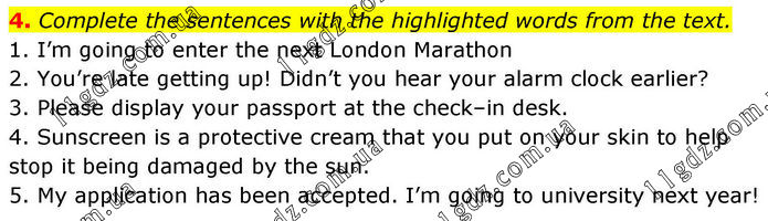 4. Complete the sentences with the highlighted words from the text. 1. I’m going to enter the next London Marathon 2. You’re late getting up! Didn’t you hear your alarm clock earlier? 3. Please display your passport at the check–in desk. 4. Sunscreen is a protective cream that you put on your skin to help stop it being damaged by the sun. 5. My application has been accepted. I’m going to university next year!