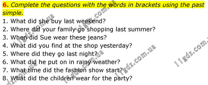 6. Complete the questions with the words in brackets using the past simple. 1. What did she buy last weekend? 2. Where did your family go shopping last summer? 3. When did Sue wear these jeans? 4. What did you find at the shop yesterday? 5. Where did they go last night? 6. What did he put on in rainy weather? 7. What time did the fashion show start? 8. What did the children wear for the party?