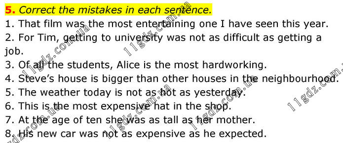 5. Correct the mistakes in each sentence. 1. That film was the most entertaining one I have seen this year. 2. For Tim, getting to university was not as difficult as getting a job. 3. Of all the students, Alice is the most hardworking. 4. Steve’s house is bigger than other houses in the neighbourhood. 5. The weather today is not as hot as yesterday. 6. This is the most expensive hat in the shop. 7. At the age of ten she was as tall as her mother. 8. His new car was not as expensive as he expected.