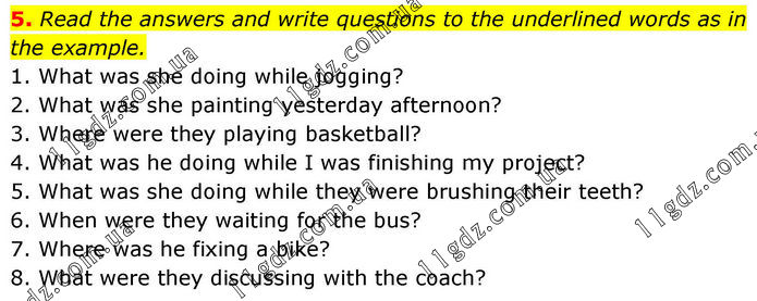 5. Read the answers and write questions to the underlined words as in the example. 1. What was she doing while jogging? 2. What was she painting yesterday afternoon? 3. Where were they playing basketball? 4. What was he doing while I was finishing my project? 5. What was she doing while they were brushing their teeth? 6. When were they waiting for the bus? 7. Where was he fixing a bike? 8. What were they discussing with the coach?