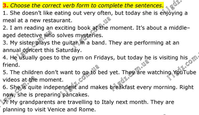 3. Choose the correct verb form to complete the sentences. 1. She doesn’t like eating out very often, but today she is enjoying a meal at a new restaurant. 2. I am reading an exciting book at the moment. It’s about a middle–aged detective who solves mysteries. 3. My sister plays the guitar in a band. They are performing at an annual concert this Saturday. 4. He usually goes to the gym on Fridays, but today he is visiting his friend. 5. The children don’t want to go to bed yet. They are watching YouTube videos at the moment. 6. She is quite independent and makes breakfast every morning. Right now, she is preparing pancakes. 7. My grandparents are travelling to Italy next month. They are planning to visit Venice and Rome.