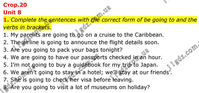 Unit 8 1. Complete the sentences with the correct form of be going to and the verbs in brackets. 1. My parents are going to go on a cruise to the Caribbean. 2. The airline is going to announce the flight details soon. 3. Are you going to pack your bags tonight? 4. We are going to have our passports checked in an hour. 5. I’m not going to buy a guidebook for my trip to Japan. 6. We aren’t going to stay in a hotel; we’ll stay at our friends’. 7. She is going to check her visa before leaving. 8. Are you going to visit a lot of museums on holiday?
