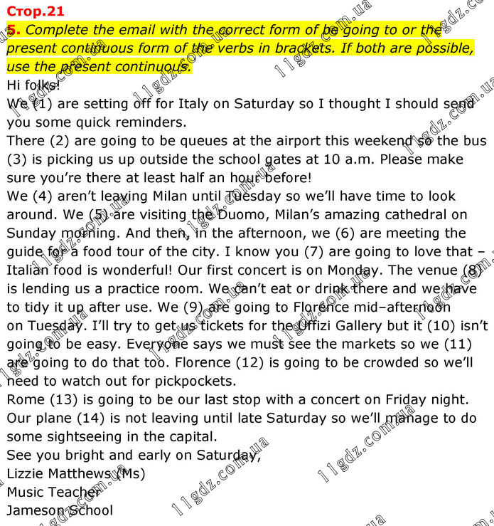 5. Complete the email with the correct form of be going to or the present continuous form of the verbs in brackets. If both are possible, use the present continuous. Hi folks! We (1) are setting off for Italy on Saturday so I thought I should send you some quick reminders. There (2) are going to be queues at the airport this weekend so the bus (3) is picking us up outside the school gates at 10 a.m. Please make sure you’re there at least half an hour before! We (4) aren’t leaving Milan until Tuesday so we’ll have time to look around. We (5) are visiting the Duomo, Milan’s amazing cathedral on Sunday morning. And then, in the afternoon, we (6) are meeting the guide for a food tour of the city. I know you (7) are going to love that – Italian food is wonderful! Our first concert is on Monday. The venue (8) is lending us a practice room. We can’t eat or drink there and we have to tidy it up after use. We (9) are going to Florence mid–afternoon on Tuesday. I’ll try to get us tickets for the Uffizi Gallery but it (10) isn’t going to be easy. Everyone says we must see the markets so we (11) are going to do that too. Florence (12) is going to be crowded so we’ll need to watch out for pickpockets. Rome (13) is going to be our last stop with a concert on Friday night. Our plane (14) is not leaving until late Saturday so we’ll manage to do some sightseeing in the capital. See you bright and early on Saturday, Lizzie Matthews (Ms) Music Teacher Jameson School