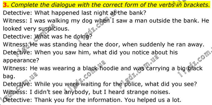 3. Complete the dialogue with the correct form of the verbs in brackets. Detective: What happened last night at the bank? Witness: I was walking my dog when I saw a man outside the bank. He looked very suspicious. Detective: What was he doing? Witness: He was standing near the door, when suddenly he ran away. Detective: When you saw him, what did you notice about his appearance? Witness: He was wearing a black hoodie and was carrying a big black bag. Detective: While you were waiting for the police, what did you see? Witness: I didn’t see anybody, but I heard strange noises. Detective: Thank you for the information. You helped us a lot.