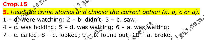 5. Read the crime stories and choose the correct option (a, b, c or d). 1 – d. were watching; 2 – b. didn’t; 3 – b. saw; 4 – c. was holding; 5 – d. was walking; 6 – a. was waiting; 7 – c. called; 8 – c. looked; 9 – b. found out; 10 – a. broke.