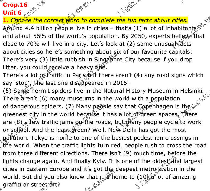 Unit 6 1. Choose the correct word to complete the fun facts about cities. Around 4.4 billion people live in cities – that’s (1) a lot of inhabitants and about 56% of the world’s population. By 2050, experts believe that close to 70% will live in a city. Let’s look at (2) some unusual facts about cities so here’s something about six of our favourite capitals: There’s very (3) little rubbish in Singapore City because if you drop litter, you could receive a heavy fine. There’s a lot of traffic in Paris but there aren’t (4) any road signs which say ‘stop’. The last one disappeared in 2016. (5) Some hermit spiders live in the Natural History Museum in Helsinki. There aren’t (6) many museums in the world with a population of dangerous spiders. (7) Many people say that Copenhagen is the greenest city in the world because it has a lot of green spaces. There are (8) a few traffic jams on the roads, but many people cycle to work or school. And the least green? Well, New Delhi has got the most pollution. Tokyo is home to one of the busiest pedestrian crossings in the world. When the traffic lights turn red, people rush to cross the road from three different directions. There isn’t (9) much time, before the lights change again. And finally Kyiv. It is one of the oldest and largest cities in Eastern Europe and it’s got the deepest metro station in the world. But did you also know that it is home to (10) a lot of amazing graffiti or street art?