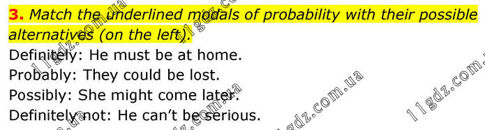 3. Match the underlined modals of probability with their possible alternatives (on the left). Definitely: He must be at home. Probably: They could be lost. Possibly: She might come later. Definitely not: He can’t be serious.