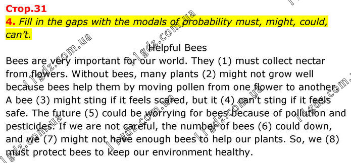 4. Fill in the gaps with the modals of probability must, might, could, can’t. Helpful Bees Bees are very important for our world. They (1) must collect nectar from flowers. Without bees, many plants (2) might not grow well because bees help them by moving pollen from one flower to another. A bee (3) might sting if it feels scared, but it (4) can’t sting if it feels safe. The future (5) could be worrying for bees because of pollution and pesticides. If we are not careful, the number of bees (6) could down, and we (7) might not have enough bees to help our plants. So, we (8) must protect bees to keep our environment healthy.