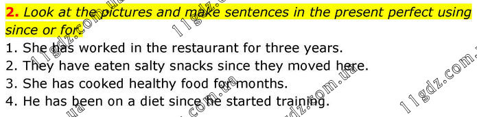 2. Look at the pictures and make sentences in the present perfect using since or for. 1. She has worked in the restaurant for three years. 2. They have eaten salty snacks since they moved here. 3. She has cooked healthy food for months. 4. He has been on a diet since he started training.