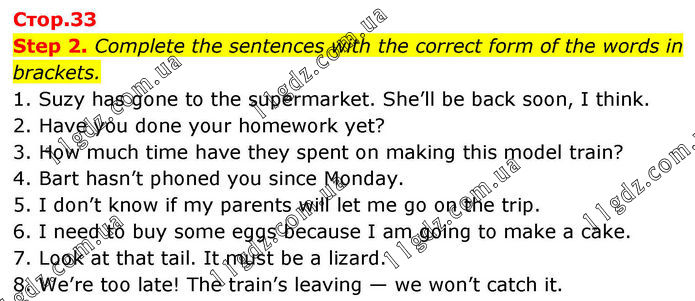 Step 2. Complete the sentences with the correct form of the words in brackets. 1. Suzy has gone to the supermarket. She’ll be back soon, I think. 2. Have you done your homework yet? 3. How much time have they spent on making this model train? 4. Bart hasn’t phoned you since Monday. 5. I don’t know if my parents will let me go on the trip. 6. I need to buy some eggs because I am going to make a cake. 7. Look at that tail. It must be a lizard. 8. We’re too late! The train’s leaving — we won’t catch it.