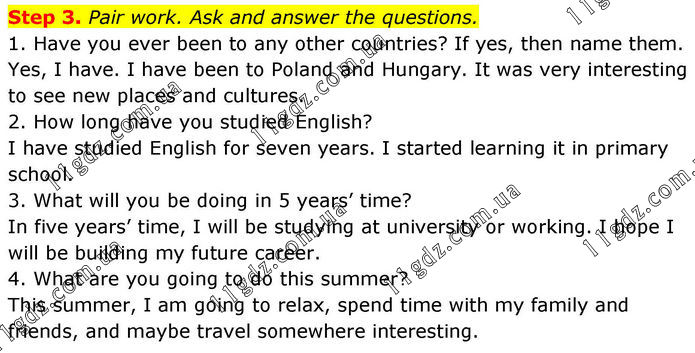 Step 3. Pair work. Ask and answer the questions. 1. Have you ever been to any other countries? If yes, then name them. Yes, I have. I have been to Poland and Hungary. It was very interesting to see new places and cultures. 2. How long have you studied English? I have studied English for seven years. I started learning it in primary school. 3. What will you be doing in 5 years’ time? In five years’ time, I will be studying at university or working. I hope I will be building my future career. 4. What are you going to do this summer? This summer, I am going to relax, spend time with my family and friends, and maybe travel somewhere interesting.