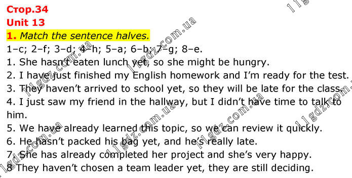 Unit 13 1. Match the sentence halves. 1–c; 2–f; 3–d; 4–h; 5–a; 6–b; 7–g; 8–e. 1. She hasn’t eaten lunch yet, so she might be hungry. 2. I have just finished my English homework and I’m ready for the test. 3. They haven’t arrived to school yet, so they will be late for the class. 4. I just saw my friend in the hallway, but I didn’t have time to talk to him. 5. We have already learned this topic, so we can review it quickly. 6. He hasn’t packed his bag yet, and he’s really late. 7. She has already completed her project and she’s very happy. 8 They haven’t chosen a team leader yet, they are still deciding.