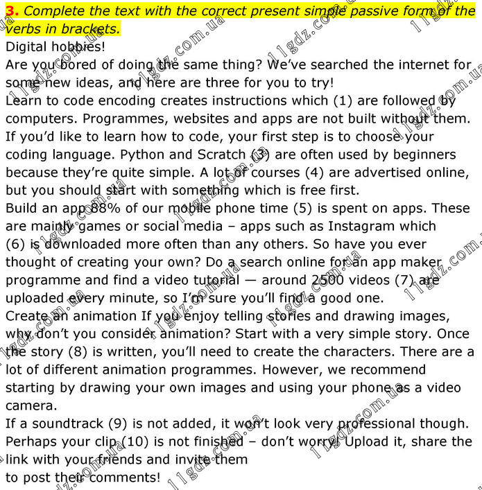 3. Complete the text with the correct present simple passive form of the verbs in brackets. Digital hobbies! Are you bored of doing the same thing? We’ve searched the internet for some new ideas, and here are three for you to try! Learn to code encoding creates instructions which (1) are followed by computers. Programmes, websites and apps are not built without them. If you’d like to learn how to code, your first step is to choose your coding language. Python and Scratch (3) are often used by beginners because they’re quite simple. A lot of courses (4) are advertised online, but you should start with something which is free first. Build an app 88% of our mobile phone time (5) is spent on apps. These are mainly games or social media – apps such as Instagram which (6) is downloaded more often than any others. So have you ever thought of creating your own? Do a search online for an app maker programme and find a video tutorial — around 2500 videos (7) are uploaded every minute, so I’m sure you’ll find a good one. Create an animation If you enjoy telling stories and drawing images, why don’t you consider animation? Start with a very simple story. Once the story (8) is written, you’ll need to create the characters. There are a lot of different animation programmes. However, we recommend starting by drawing your own images and using your phone as a video camera. If a soundtrack (9) is not added, it won’t look very professional though. Perhaps your clip (10) is not finished – don’t worry! Upload it, share the link with your friends and invite them to post their comments!