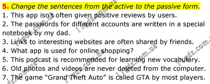 5. Change the sentences from the active to the passive form. 1. This app isn’t often given positive reviews by users. 2. The passwords for different accounts are written in a special notebook by my dad. 3. Links to interesting websites are often shared by friends. 4. What app is used for online shopping? 5. This podcast is recommended for learning new vocabulary. 6. Old photos and videos are never deleted from the computer. 7. The game “Grand Theft Auto” is called GTA by most players.