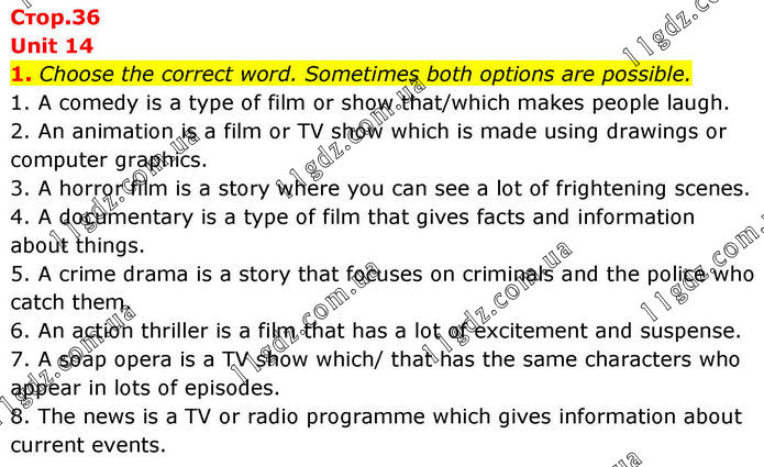 Unit 14 1. Choose the correct word. Sometimes both options are possible. 1. A comedy is a type of film or show that/which makes people laugh. 2. An animation is a film or TV show which is made using drawings or computer graphics. 3. A horror film is a story where you can see a lot of frightening scenes. 4. A documentary is a type of film that gives facts and information about things. 5. A crime drama is a story that focuses on criminals and the police who catch them. 6. An action thriller is a film that has a lot of excitement and suspense. 7. A soap opera is a TV show which/ that has the same characters who appear in lots of episodes. 8. The news is a TV or radio programme which gives information about current events.