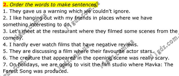 2. Order the words to make sentences. 1. They gave us a warning which we couldn’t ignore. 2. I like hanging out with my friends in places where we have something interesting to do. 3. Let’s meet at the restaurant where they filmed some scenes from the comedy. 4. I hardly ever watch films that have negative reviews. 5. They are discussing a film where their favourite actor stars. 6. The creature that appeared in the opening scene was really scary. 7. On holidays, we are going to visit the film studio where Mavka: The Forest Song was produced.
