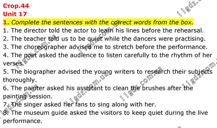 Unit 17 1. Complete the sentences with the correct words from the box. 1. The director told the actor to learn his lines before the rehearsal. 2. The teacher told us to be quiet while the dancers were practising. 3. The choreographer advised me to stretch before the performance. 4. The poet asked the audience to listen carefully to the rhythm of her verses. 5. The biographer advised the young writers to research their subjects thoroughly. 6. The painter asked his assistant to clean the brushes after the painting session. 7. The singer asked her fans to sing along with her. 8. The museum guide asked the visitors to keep quiet during the live performance.