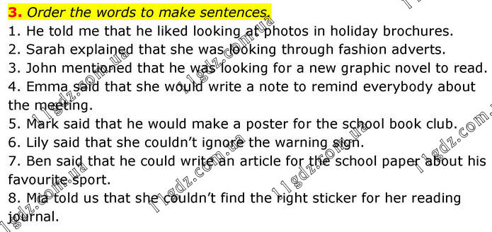 3. Order the words to make sentences. 1. He told me that he liked looking at photos in holiday brochures. 2. Sarah explained that she was looking through fashion adverts. 3. John mentioned that he was looking for a new graphic novel to read. 4. Emma said that she would write a note to remind everybody about the meeting. 5. Mark said that he would make a poster for the school book club. 6. Lily said that she couldn’t ignore the warning sign. 7. Ben said that he could write an article for the school paper about his favourite sport. 8. Mia told us that she couldn’t find the right sticker for her reading journal.