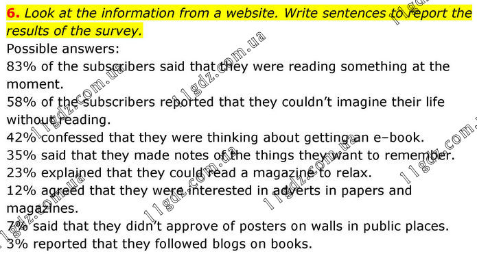 6. Look at the information from a website. Write sentences to report the results of the survey. Possible answers: 83% of the subscribers said that they were reading something at the moment. 58% of the subscribers reported that they couldn’t imagine their life without reading. 42% confessed that they were thinking about getting an e–book. 35% said that they made notes of the things they want to remember. 23% explained that they could read a magazine to relax. 12% agreed that they were interested in adverts in papers and magazines. 7% said that they didn’t approve of posters on walls in public places. 3% reported that they followed blogs on books.
