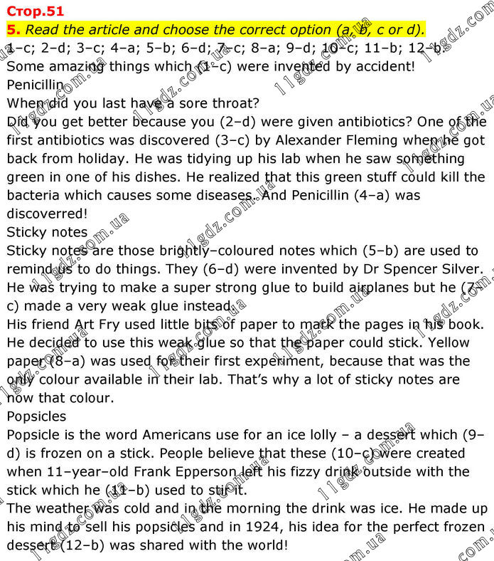 5. Read the article and choose the correct option (a, b, c or d). 1–c; 2–d; 3–c; 4–a; 5–b; 6–d; 7–c; 8–a; 9–d; 10–c; 11–b; 12–b. Some amazing things which (1–c) were invented by accident! Penicillin When did you last have a sore throat? Did you get better because you (2–d) were given antibiotics? One of the first antibiotics was discovered (3–c) by Alexander Fleming when he got back from holiday. He was tidying up his lab when he saw something green in one of his dishes. He realized that this green stuff could kill the bacteria which causes some diseases. And Penicillin (4–a) was discoverred! Sticky notes Sticky notes are those brightly–coloured notes which (5–b) are used to remind us to do things. They (6–d) were invented by Dr Spencer Silver. He was trying to make a super strong glue to build airplanes but he (7–c) made a very weak glue instead. His friend Art Fry used little bits of paper to mark the pages in his book. He decided to use this weak glue so that the paper could stick. Yellow paper (8–a) was used for their first experiment, because that was the only colour available in their lab. That’s why a lot of sticky notes are now that colour. Popsicles Popsicle is the word Americans use for an ice lolly – a dessert which (9–d) is frozen on a stick. People believe that these (10–c) were created when 11–year–old Frank Epperson left his fizzy drink outside with the stick which he (11–b) used to stir it. The weather was cold and in the morning the drink was ice. He made up his mind to sell his popsicles and in 1924, his idea for the perfect frozen dessert (12–b) was shared with the world!