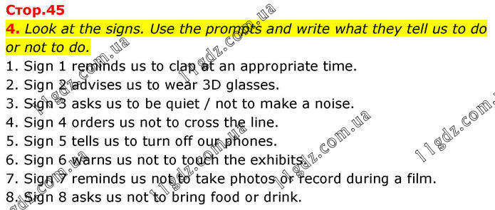 4. Look at the signs. Use the prompts and write what they tell us to do or not to do. 1. Sign 1 reminds us to clap at an appropriate time. 2. Sign 2 advises us to wear 3D glasses. 3. Sign 3 asks us to be quiet / not to make a noise. 4. Sign 4 orders us not to cross the line. 5. Sign 5 tells us to turn off our phones. 6. Sign 6 warns us not to touch the exhibits. 7. Sign 7 reminds us not to take photos or record during a film. 8. Sign 8 asks us not to bring food or drink.