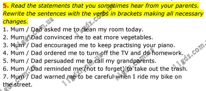 5. Read the statements that you sometimes hear from your parents. Rewrite the sentences with the verbs in brackets making all necessary changes. 1. Mum / Dad asked me to clean my room today. 2. Mum / Dad convinced me to eat more vegetables. 3. Mum / Dad encouraged me to keep practising your piano. 4. Mum / Dad ordered me to turn off the TV and do homework. 5. Mum / Dad persuaded me to call my grandparents. 6. Mum / Dad reminded me (not to forget) to take out the trash. 7. Mum / Dad warned me to be careful when I ride my bike on the street.