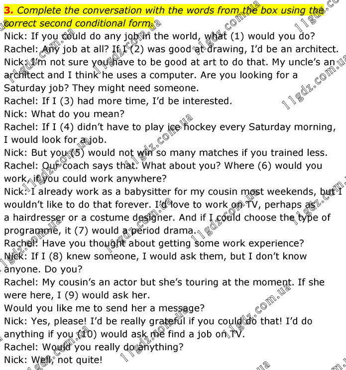 3. Complete the conversation with the words from the box using the correct second conditional form. Nick: If you could do any job in the world, what (1) would you do? Rachel: Any job at all? If I (2) was good at drawing, I’d be an architect. Nick: I’m not sure you have to be good at art to do that. My uncle’s an architect and I think he uses a computer. Are you looking for a Saturday job? They might need someone. Rachel: If I (3) had more time, I’d be interested. Nick: What do you mean? Rachel: If I (4) didn’t have to play ice hockey every Saturday morning, I would look for a job. Nick: But you (5) would not win so many matches if you trained less. Rachel: Our coach says that. What about you? Where (6) would you work, if you could work anywhere? Nick: I already work as a babysitter for my cousin most weekends, but I wouldn’t like to do that forever. I’d love to work on TV, perhaps as a hairdresser or a costume designer. And if I could choose the type of programme, it (7) would a period drama. Rachel: Have you thought about getting some work experience? Nick: If I (8) knew someone, I would ask them, but I don’t know anyone. Do you? Rachel: My cousin’s an actor but she’s touring at the moment. If she were here, I (9) would ask her. Would you like me to send her a message? Nick: Yes, please! I’d be really grateful if you could do that! I’d do anything if you (10) would ask me find a job on TV. Rachel: Would you really do anything? Nick: Well, not quite!