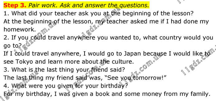 Step 3. Pair work. Ask and answer the questions. 1. What did your teacher ask you at the beginning of the lesson? At the beginning of the lesson, my teacher asked me if I had done my homework. 2. If you could travel anywhere you wanted to, what country would you go to? If I could travel anywhere, I would go to Japan because I would like to see Tokyo and learn more about the culture. 3. What is the last thing your friend said? The last thing my friend said was, “See you tomorrow!” 4. What were you given for your birthday? For my birthday, I was given a book and some money from my family.