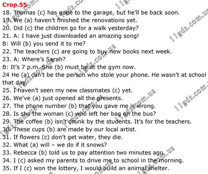 18. Thomas (c) has gone to the garage, but he’ll be back soon. 19. We (a) haven’t finished the renovations yet. 20. Did (c) the children go for a walk yesterday? 21. A: I have just downloaded an amazing song! B: Will (b) you send it to me? 22. The teachers (c) are going to buy new books next week. 23. A: Where’s Sarah? B: It’s 7 p.m. She (b) must be at the gym now. 24 He (a) can’t be the person who stole your phone. He wasn’t at school that day. 25. I haven’t seen my new classmates (c) yet. 26. We’ve (a) just opened all the presents. 27. The phone number (b) that you gave me is wrong. 28. Is she the woman (c) who left her bag on the bus? 29. The coffee (b) isn’t drunk by the students. It’s for the teachers. 30. These cups (b) are made by our local artist. 31. If flowers (c) don’t get water, they die. 32. What (a) will – we do if it snows? 33. Rebecca (b) told us to pay attention two minutes ago. 34. I (c) asked my parents to drive me to school in the morning. 35. If I (c) won the lottery, I would build an animal shelter.