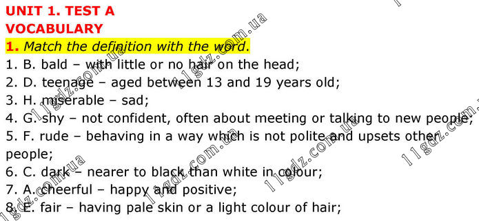 UNIT 1. TEST A VOCABULARY 1. Match the definition with the word. 1. B. bald – with little or no hair on the head; 2. D. teenage – aged between 13 and 19 years old; 3. H. miserable – sad; 4. G. shy – not confident, often about meeting or talking to new people; 5. F. rude – behaving in a way which is not polite and upsets other people; 6. C. dark – nearer to black than white in colour; 7. A. cheerful – happy and positive; 8. E. fair – having pale skin or a light colour of hair;