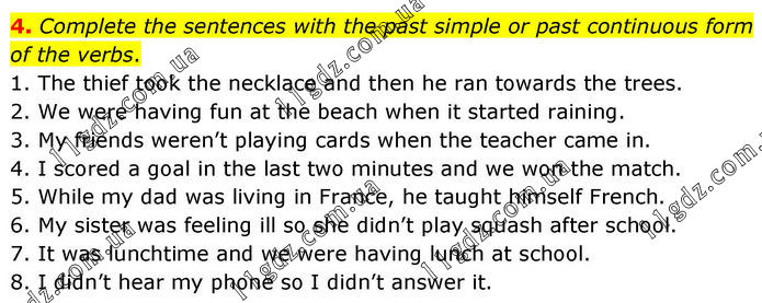 4. Complete the sentences with the past simple or past continuous form of the verbs. 1. The thief took the necklace and then he ran towards the trees. 2. We were having fun at the beach when it started raining. 3. My friends weren’t playing cards when the teacher came in. 4. I scored a goal in the last two minutes and we won the match. 5. While my dad was living in France, he taught himself French. 6. My sister was feeling ill so she didn’t play squash after school. 7. It was lunchtime and we were having lunch at school. 8. I didn’t hear my phone so I didn’t answer it.
