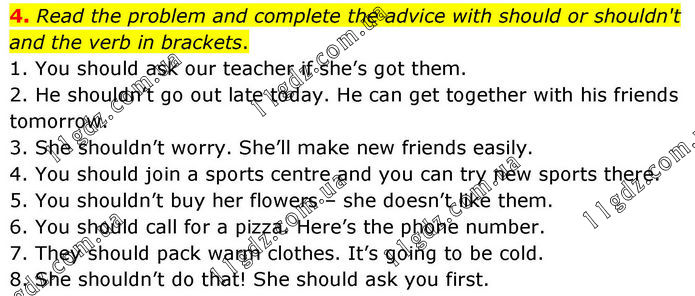 4. Read the problem and complete the advice with should or shouldn't and the verb in brackets. 1. You should ask our teacher if she’s got them. 2. He shouldn’t go out late today. He can get together with his friends tomorrow. 3. She shouldn’t worry. She’ll make new friends easily. 4. You should join a sports centre and you can try new sports there. 5. You shouldn’t buy her flowers – she doesn’t like them. 6. You should call for a pizza. Here’s the phone number. 7. They should pack warm clothes. It’s going to be cold. 8. She shouldn’t do that! She should ask you first.