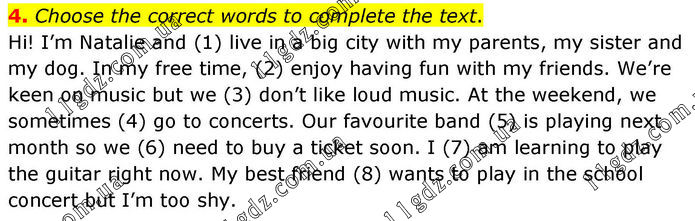 4. Choose the correct words to complete the text. Hi! I’m Natalie and (1) live in a big city with my parents, my sister and my dog. In my free time, (2) enjoy having fun with my friends. We’re keen on music but we (3) don’t like loud music. At the weekend, we sometimes (4) go to concerts. Our favourite band (5) is playing next month so we (6) need to buy a ticket soon. I (7) am learning to play the guitar right now. My best friend (8) wants to play in the school concert but I’m too shy.