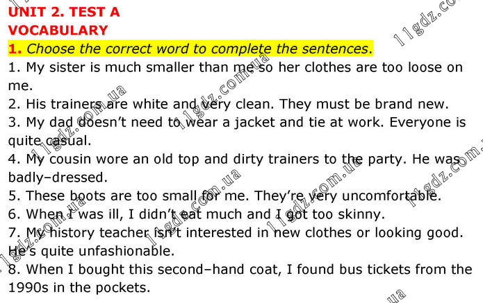 UNIT 2. TEST A VOCABULARY 1. Choose the correct word to complete the sentences. 1. My sister is much smaller than me so her clothes are too loose on me. 2. His trainers are white and very clean. They must be brand new. 3. My dad doesn’t need to wear a jacket and tie at work. Everyone is quite casual. 4. My cousin wore an old top and dirty trainers to the party. He was badly–dressed. 5. These boots are too small for me. They’re very uncomfortable. 6. When I was ill, I didn’t eat much and I got too skinny. 7. My history teacher isn’t interested in new clothes or looking good. He’s quite unfashionable. 8. When I bought this second–hand coat, I found bus tickets from the 1990s in the pockets.
