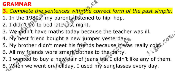 GRAMMAR 3. Complete the sentences with the correct form of the past simple. 1. In the 1980s, my parents listened to hip–hop. 2. I didn’t go to bed late last night. 3. We didn’t have maths today because the teacher was ill. 4. My best friend bought a new jumper yesterday. 5. My brother didn’t meet his friends because it was really cold. 6. All my friends wore smart clothes to the party. 7. I wanted to buy a new pair of jeans but I didn’t like any of them. 8. When we went on holiday, I used my sunglasses every day.