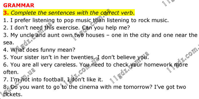 GRAMMAR 3. Complete the sentences with the correct verb. 1. I prefer listening to pop music than listening to rock music. 2. I don’t need this exercise. Can you help me? 3. My uncle and aunt own two houses – one in the city and one near the sea. 4. What does funny mean? 5. Your sister isn’t in her twenties. I don’t believe you. 6. You are all very careless. You need to check your homework more often. 7. I’m not into football. I don’t like it. 8. Do you want to go to the cinema with me tomorrow? I’ve got two tickets.