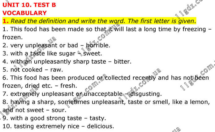 UNIT 10. TEST B VOCABULARY 1. Read the definition and write the word. The first letter is given. 1. This food has been made so that it will last a long time by freezing – frozen. 2. very unpleasant or bad – horrible. 3. with a taste like sugar – sweet. 4. with an unpleasantly sharp taste – bitter. 5. not cooked – raw. 6. This food has been produced or collected recently and has not been frozen, dried etc. – fresh. 7. extremely unpleasant or unacceptable – disgusting. 8. having a sharp, sometimes unpleasant, taste or smell, like a lemon, and not sweet – sour. 9. with a good strong taste – tasty. 10. tasting extremely nice – delicious.