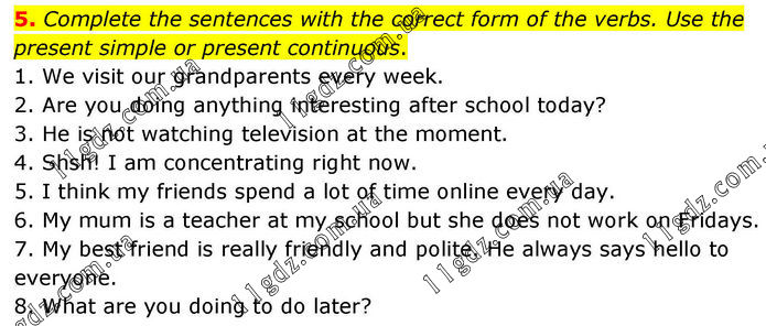 5. Complete the sentences with the correct form of the verbs. Use the present simple or present continuous. 1. We visit our grandparents every week. 2. Are you doing anything interesting after school today? 3. He is not watching television at the moment. 4. Shsh! I am concentrating right now. 5. I think my friends spend a lot of time online every day. 6. My mum is a teacher at my school but she does not work on Fridays. 7. My best friend is really friendly and polite. He always says hello to everyone. 8. What are you doing to do later?